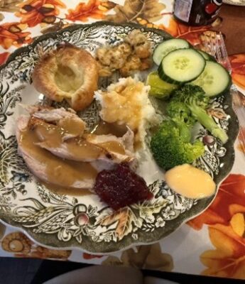 カナダでは毎年10月の第2月曜日に「Thanksgiving Day(感謝祭)」という祝日があります。家族や親しい友人、親戚に感謝を伝える日です。もともとは秋の収穫に感謝する日として始まった行事だそうです。現在では、カナダやアメリカで、家族や友人と食事を楽しみながら一緒に過ごす日になっています。私はホストマザーと一緒に、ホストマザーの友人のお宅で過ごしました。伝統的な料理として、ターキーやマッシュポテト、パンプキンパイをいただきました。ターキーやマッシュポテトにはグレイビーソースをかけます。グレイビーソースはカナダの伝統料理「プーチン」にも使われるソースです。夕食後は、会話を楽しんだり、ゲームで遊んだりして過ごしました。日本にはない年に一度の温かい行事に参加でき、とても良い経験になりました。