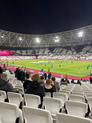 そして最終日はロンドンスタジアムでWest Ham v Brighton の試合を見ました。この試合は19時30分キックオフだったのですがとても寒くて手袋まで装備しておくべきだったと後悔しました。そしてこの試合は両チームのサポーターが隣り合わせるような場所のチケットを購入していたため、試合中は日本では決して見ることのできない煽りあいを見ることができました。大人だけでなく子供までさらには親子で応援しあっていて、本場のフットボールを感じました。
