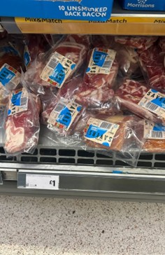売れ残ったベーコンをまとめて安売りしていて、たったの£1で買えるのでおすすめです!冷凍してパスタに入れたりしていました。