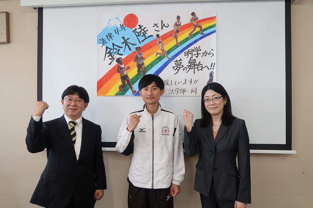 (左から、今尾法学部長,鈴木さん,黒田法律学科主任教授・陸上競技部長距離ブロック部長)