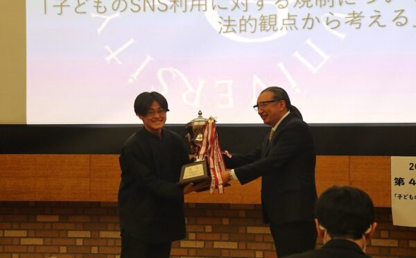 近藤学部長による激励のご挨拶の後、各チームがそれぞれの法的主張を発表する【第一弁論】がスタートしました。憲法12条、13条、21条、25条、26条、子どもの権利条約、青少年インターネット環境整備法等に照らし、工夫を凝らした弁論が展開されました。