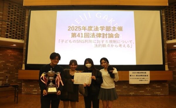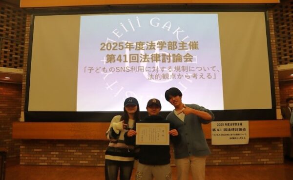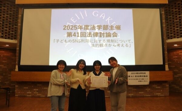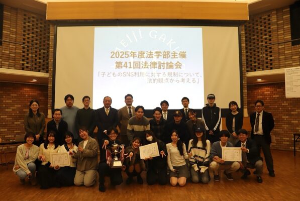 2025年10月29日(水)13時00分〜17時00分、白金キャンパスのアートホールで、第41回法律討論会が開催されました。今年度のテーマは、『子どものSNS利用に対する規制について、法的観点から考える』です。法学部の法律学科・消費情報環境法学科・政治学科・グローバル法学科から4チームが参加しました。